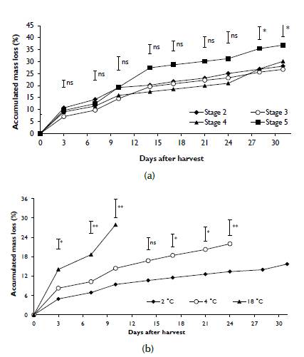 Figure 1: Effect of a) the maturity stage and b) storage temperatures on the accumulated loss of mass of plum fruits during postharvest cold-storage.