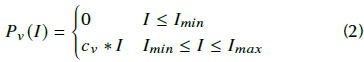 where, P v (I) is the output power of the PV in terms of the irradiance, I; I min = 200 W/m 2 is the minimum irradiance from which the solar cells start generating energy; c v = 1, 415 m 2 is the generation coefficient of the PV arrays; and I max = 1000 W/m 2 is established as the standard irradiance on the terrestrial surface, for which the rated PV power is defined.