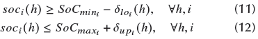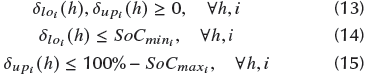 Regarding the SoC of the ESSs, in the case of Liion technologies, even when they can be within the range [0%, 100%], the SoCs should not exceed the limits [SoCmini,SoCmaxi] = [20%,90%] to avoid an accelerated degradation (Linden and Reddy 2001). This restriction has been considered as a soft constraint byincluding the variables δloi (h) and δloi (h). In this way, the boundaries of the SoCs can be written as,