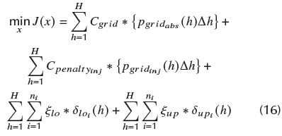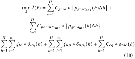 where Cgrid is the price of electricity per kWh; CpenaltyinJ, is a penalty for injecting power into the main grid; and ξl0 and ξup correspond to the penalty coefficients related to the soft constraints to lower and upper boundaries of the SoC presented in Equations (11) and (12). Thus, the first term in Equation (16) is related to the cost of using energy from the main grid. The second term is a penalty for injecting energy into the main grid (de la Hoz et al. 2019), which manages to prioritize the local use of RES energy and, consequently, store the energy surplus in the ESSs, whenever possible. Meanwhile, the last two terms in Equation (16) are penalties for injecting energy into the main grid, which help the ESSs to work mainly with partial SoC, to avoid their early degradation.