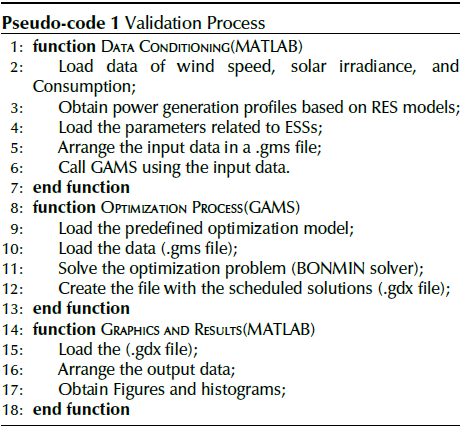 To evaluate the proposed strategies, GAMS v. 24.2.3 is used as an algebraic modeling language, selecting the BONMIN solver (GAMS 2013b, GAMS 2013a), while the input parameters and results are processed and analyzed by using Matlab R2018b (Mathworks 2016). The available power profiles of the renewable resources were obtained by means of the Equations (1) and (2), using wind speed and irradiance data from Aalborg, Denmark, which were acquired in (Aalborg University n.d.). Pseudo-code 1 summarizes the validation process.