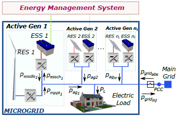 The implemented EMS seeks to schedule the use of the ESSs of the different active generators in such a way that the consumption of electrical energy absorbed from the main grid is minimized, and, at the same time, maximizes the use of the generated renewable energy within the microgrid. To this effect, the optimization problem poses a general model that allows the scalability of the number of active generators and the flexibility related to the characteristics of their DERs. It should be noted that the model focuses on the ESSs management and does not consider any demand response program.