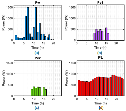 The behavior of the system with the optimization strategy, described in section III.A. (optimization strategy from now on), and with the optimization plus equalization, presented in section III.B. (equalization scheme hereafter), is simulated for a specific day, so that the differences in operation of the proposed management systems can be observed. For this, the power profiles of the RES and the demand curve presented in Figure 2 and the parameters related to ESS included in Table 1 are established. In Figure 2(P w ) corresponds to the generation profile for the WT generator in the active generator 1 (AG1), (Pv1) corresponds to generation profile for the PV generator in the active generator 2 (AG2), (Pv2) corresponds to generation profile for the PV generator in the active generator 3 (AG3), and (P v2 ) corresponds to the load profile.