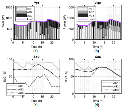 The scheduling of the active generators considering the selected generation scenario using the two optimization strategies is shown in Figure 3(a) and (b), while the expected SoCs are presented in Figure 3(c) and (d). In this case, it is not necessary to absorb energy from the main grid.