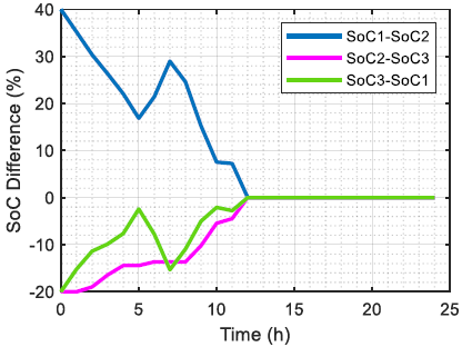 In addition, the differences between the SoCs of the ESSs remain below 40% and decrease along T, reaching zero from the middle of the day (Figure 4).
