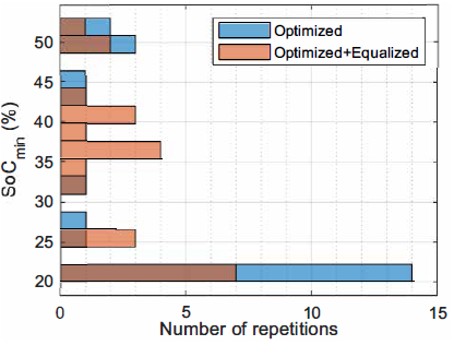 For the selected scenarios, the optimized strategy caused DoDs greater than 65% in most cases, (17 times of 24), whereas, with the equalized strategy, this condition was evident 12 times. Additionally, a full discharge (SoC = SoC min ) was reached 14 times with the optimized strategy, while this occurred only 7 times when the equalization was performed.