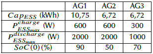 where Xbati (h) is a binary variable to establish the status of charge of the ESSs. In Equation (6), the upper bound of Pagi (h) is the nominal power of its associated RES, PREsnom-. The power exchange between the microgrid and the utility is limited to not exceed Pgridmax = 2 kW, which corresponds to physical and/or market constraints. Likewise, The boundaries of the charging and discharging powers for the ESSs defined in Equations (9) and (10) are Pchar ge ESSmaxi kW and Pdischarge ESSmaxi kW, respectively, as recommended by the manufacturers (Linden and Reddy 2001, Battery University n.d.).