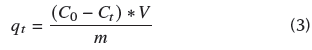 where C 0 (mg/L) is the initial concentration of the metal, C t (mg/L) is the metal concentration in the liquid phase at a time f, m is the mass of adsorbent used in (g), and V, the volume of the solution in (L).