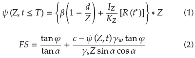where d is the water table depth measured normal to the ground surface, Z is the soil depth, I z is the rainfall intensity, Kz is the soil hydraulic conductivity, φ is the soil friction angle, α is the slope angle, c is soil cohesion, γ w is the unit weight of groundwater, and γ s is the soil unit weight.
