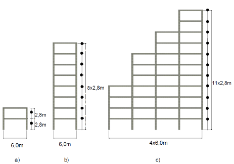 Three buildings discretized as plane frames were the structures chosen to be studied in this work, assuming the rigid diaphragm hypothesis as valid. Each developed model has the following dimensions: 2,8 m of floor-to-floor height and 6 m of column spacing. The maximum heights of the structural systems are 5,6, 22,4, and 30,8 m, which are related to buildings with two (model A), eight (model B), and eleven stories (model C), respectively. The two- and eight-floor buildings consist of a single span, while the eleven-floor building consists of four spans with variable heights. Concrete with a compressive strength (f" c) of 28 MPa is assumed to be the material used for the construction of the frames. The sections of beams and columns are assumed to be square, with cross-sectional areas of 30 and 40 cm, respectively. The fundamental frequencies of the structures are 36,32, 7,48, and 7,19 rad/sec for models A, B, and C, respectively. The damping matrix is calculated as a Rayleigh damping matrix proportional to the stiffness and mass matrices, assuming a critical damping ratio of 5% for the first and last modes of vibration. Figure 1 illustrates the frames used.