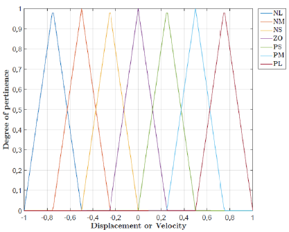 The input and output membership functions used in the fuzzification and defuzzification processes are composed of identical triangles with a 50% overlap. Figure 3 presents the input membership functions (displacement or velocity), whereas Figure 4 presents the output membership functions (voltage).
