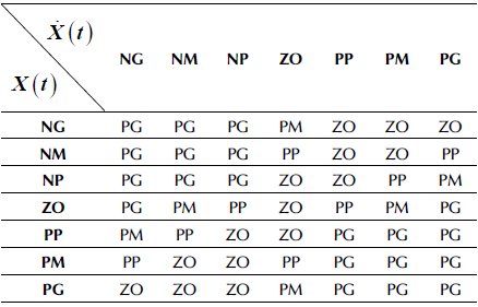 Table 2 shows the controller inference system defined by Liu et al. (2001). The linguistic fuzzy values NL, NM, NS, ZO, PS, PM, and PL mean Negative Large, Negative Medium, Negative Small, Zero, Positive Small, Positive Medium, and Positive Large, respectively.