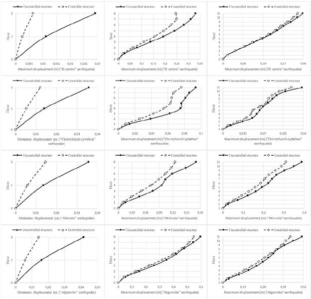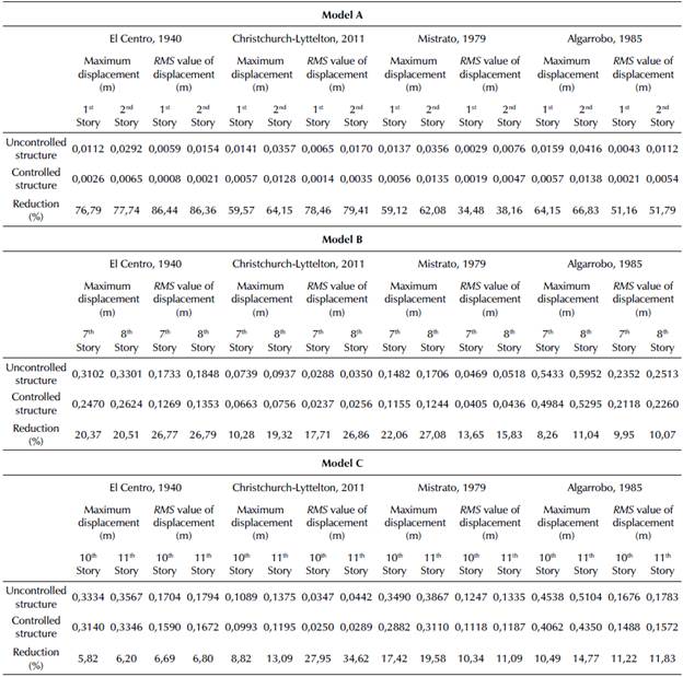 Although the decrease in the reduction percentages may lead to consider that the configuration used in the controller loses its effectiveness in high structures, a deeper analysis allows deducing that the reduction in the lateral displacement magnitudes of the structures in models B and C are similar or even higher than those obtained for model A. An example of this is the response of the three modeled structures when excited by the acceleration produced by the Algarrobo earthquake. For this case, a maximum lateral displacement reduction of 2,78 cm was reached on the second floor of model A. On the other hand, the magnitude of the maximum lateral displacement reductions for the discretized structures in models B and C reached values of 6,57 and 7,54 cm on floors eight and eleven, respectively. These results reaffirm that the control system is a valid strategy to be used in the reduction of lateral displacement in low- and medium-height buildings.