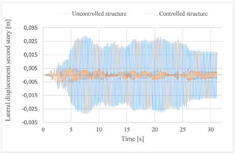The data obtained from the analysis of the RMS displacement response for models B and C ratify the reductions obtained using the developed controller. In model B, the highest reduction of the RMS displacement response for the controlled structure was reached when the structure was excited by El Centro earthquake, obtaining reductions of up to 27% for the last two stories of the building. On the other hand, when the Algarrobo earthquake excited the structure, the RMS displacement responses were lower, with decreased up to 10% in the last two stories of the modeled building. The reduction in the RMS values of displacement in the last two stories of the controlled model C was up to 34%.