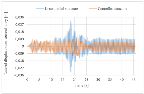 As mentioned above, each model, in its uncontrolled and controlled configuration, was excited by four different seismic records, and their respective numerical responses were determined. Every controlled structure was equipped with two MR dampers installed in the two first stories of the frames. The MR dampers were managed by the classic fuzzy-logic algorithm described above, which calculates the optimal damping forces to be provided by the MR dampers in order to reduce the structural response. A comparative response analysis for the controlled and uncontrolled systems was carried out to evaluate the performance of the developed controller.