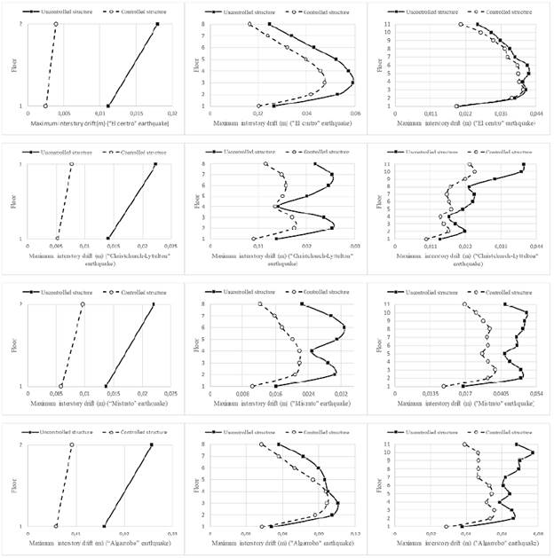 Figure 10: Interstory drift graphs for the uncontrolled and controlled structures