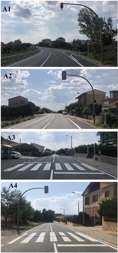 The LR-124 road crosses the village of Ábalos, in a segment of approximately 630 m, which divides the urban area in two parts, one of them being quite bigger than the other (Figure 1). However, the only ways to go from one part to the other are the existing two crosswalks. Pedestrians must cross this interurban road with a significant amount of traffic. With the aim of reducing the speed of vehicles when going through the village, traffic lights turning red if the speed limit is exceeded were installed in both directions as a TCM. Their location, as well as that of the crosswalks, is shown in Figure 1. In each direction, the sequence of the TCMs is as follows: