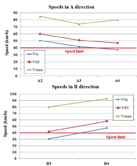 More than 4 300 vehicles were measured in this research. Table 2 presents the average speed of the vehicles, V m ; the percentile 85th of the speed, V85, which is the speed not reached by 85% of vehicles or, in other words, the speed achieved or exceeded by 15% of the vehicles); the maximum speed, V max ; and the total number of vehicles controlled. Additionally, the number of vehicles that exceeded the speed limit (40 km/h) and the percentages of vehicles exceeding this limit are shown.