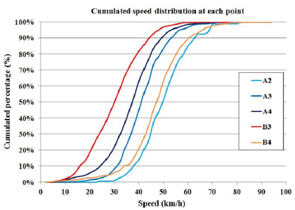 If we compare the values in both traffic lights, the one in point B3 resulted in a greater speed reduction than the one in A2. This lower speed was due to the presence of a crosswalk. Drivers might not have respected a red light or a fine, but if there were crosswalks, they would know that a pedestrian might want to cross the carriageway, and, they would unconsciously speed down to have time to stop the vehicle if such pedestrian appeared. This trend was also observed in direction A, since lower speeds were registered in the crosswalks than in the traffic lights. Drivers might not have respected the red light, but they preferred to speed down in the presence of a crosswalk due to the possible presence of pedestrians. Figure 5 shows the cumulated distribution of the registered speeds in each point.