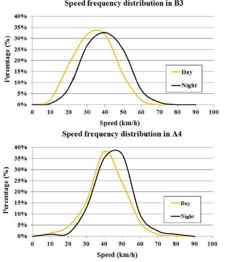 Figure 6: Speed frequency distribution in point A4/B3 during the daylight and night: a) in point B3, b) in point A4.