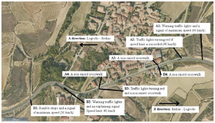 Figure 2: Traffic calming measures in direction A (Logroño-Briñas).