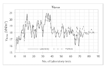 As seen in Table 7, MoPesm had a particularly good performance when compared to laboratory results and literature models, with a mean of 18,478 kN/m3, very close to that of the laboratory dataset (18,227 kN/m3), a standard deviation (0,835 kN/m3) a little lower than the laboratory dataset (1,072 kN/m3), and, among the analyzed models, one of the smallest MAPE (2,57%) and highest R2 (0,763).