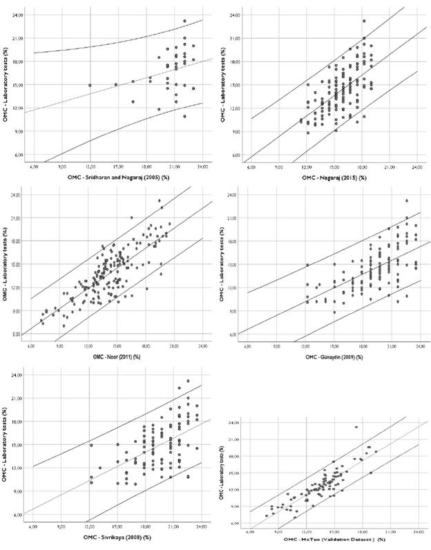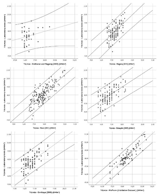 Figure 4 shows a visual comparison between scatter plots for all evaluated literature models for ydmax, and Figure 5, for OMC. In these scatter plots, the offset lines above and below the fitted line represent the 95% confidence interval, and the dashed lines correspond to y = x.