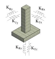 where F is the force applied on a structural element; K T is the element's translational stiffness constant; d is the displacement in the force's direction; M is the torsional or bending moment applied on the structural element; K R is the element's rotational stiffness constant; and θ is the rotation in the moment's direction. To make soil-structure interaction possible, it is necessary to obtain the values of F, d, M, and θ. Thus, the values of K T and K R , can be calculated for each direction, representing the equivalent spring constants for the foundation system, as shown in Figure 1. It is worth noting that that K T and F = K R remain linear, with a single value for each direction (Wu and Pantelides, 2019).