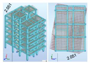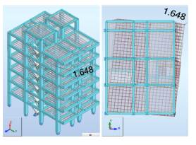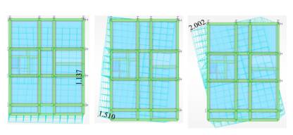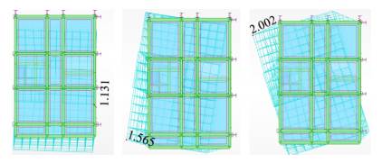 The first step in the analysis is the correct design of the structure, in accordance with the regulations (ACI, 2014 2019; NEC, 2015; ASCE/FEMA, 2000), aiming to guarantee a good capacity, stiffness, and seismic response. Vibrational modes and displacements (mm) for the three main periods are shown in Figures 4, 5, and 6 for modal analysis with fixed structure. Note that these displacements are the result of the application of Equations (6) and (7) for each DOF and for each vibrational mode.