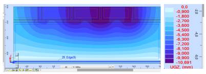 Following the traditional procedure, reactions from the superstructure are turned into actions on the substructure, in order to analyze and design the foundation system for the three soil types. The sizes of the foundations have been selected so as not to exceed the allowable stresses at the foundation level, which are represented in Figures 10 and 11 by soil type. The influence of the foundation system was checked, concluding that there was no considerable difference in stress and displacements. The foundation system was analyzed using equivalent springs for vertical displacements at the base to simulate soil elasticity (Figure 7), based on Ballast coefficient (Meli Piralla, 1986). The equivalent soil stiffness is shown in Table 1, using a finite element node spacing of 25 cm (de Macedo Wahrhaftig, 2020) (Figures 8 and 9).