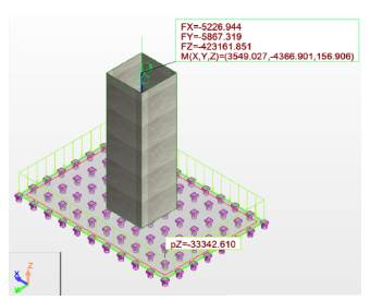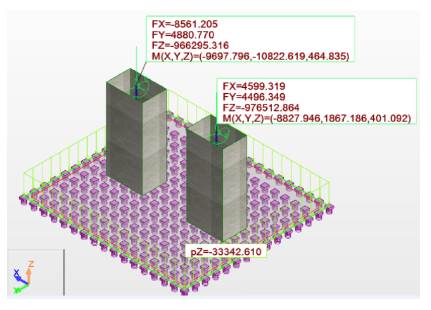 Figure 9: Foundation system using equivalent springs at the combined foundation base (kN, kN.m).