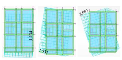 Figure 13: Maximum displacements for soil C (cm): the 1st mode on the left, the 2nd mode in the middle, and the 3rd mode on the right.