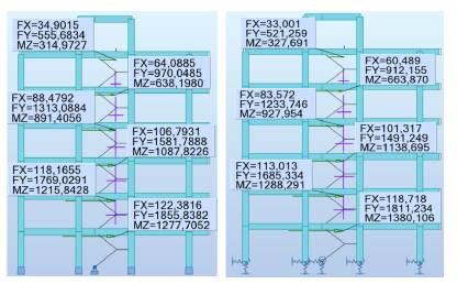 The direct relationship between bending moment and shear force implies an increase in shear effects; hence, a measurement of quantities of stirrups per length was established, as shown in Tables 19 and 20. Please note that stirrups quantities increase in average for beams and columns, and this is related to the increase bending moments due to gravitational effects and the reduction of the stiffness. Tables 21 and 22 show the base shear, and, for soil E, there is an amplification consistent with these results, whereas, for soils A and C, a reduction is observed while gravitational forces still increase.