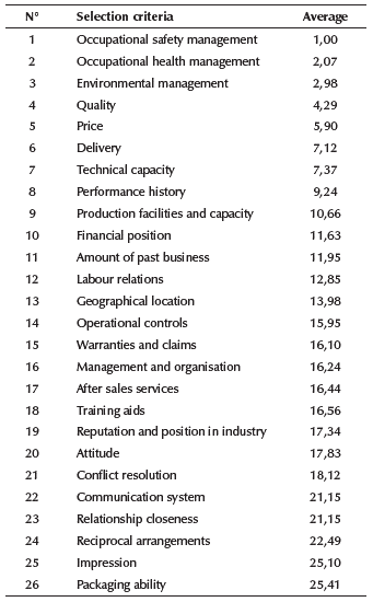 The results show that the criteria for selecting service providers most valued by the respondents are first; management in occupational safety, in second place; management in occupational health, thirdly; environmental management, fourth; quality, in fifth place; the price, in sixth place; delivery on time, seventh; technical capacity; and later; the rest of the selection criteria indicated in Dickson's research (1966). These results are consistent with the existing literature, since they correspond to the environmental and social criteria for the selection of sustainable suppliers from the research of Zimmer, Frohling and Schultmann (2016) (Table 6). Already in the bidding process itself, the technical criteria evaluated may include: quality of services, the company's experience in the field, the profile of the staff, the equipment and tools to perform the service, and the work methodology. In addition, to include a safety evaluation that analyzes the accident rate and the operational risk matrix, an occupational health and hygiene evaluation that includes the analysis of occupational diseases and physical design of the work environment; and lastly, an environmental assessment that considers an assessment of the polluting agents and the degree of exposure of the workers.