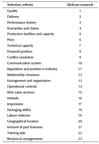 The supply chain is "a set of three or more entities that directly participate in the flow of products, services, finances and/or information from a source to a customer" (Mentzer, Dewitt, Keebler and Zacharia, 2016). According to Marques, Paiva, Beheregarai and Teixeira (2012), the supply chain is a phenomenon that always occurs when companies establish relationships, regardless of the level of existing management. The supply chain concept is applicable to mining because it is made up of a group of companies that have facilities, functional activities and distribution systems that seek to deliver minerals to different customers. Additionally, it should be pointed out that in the Chilean case, the production chains resemble the concept of the supply chain because they are made up of supply, exploration, exploitation, profit, marketing and consumer companies, which generate different relationships between they, such as: productive chains or agglomerations of companies among others, which focus on increasing productivity and the use of mineral resources (Arias, Atienza and Cademartori, 2014). The Copper mining is the most relevant economic activity for Chile since it represents more than 10% of GDP, more than 50% of exports, it is the main recipient of direct foreign investment, with 30% of total production and It maintains a third of the known reserves, the largest globally (Bustos-Gallardo and Prieto, 2019). In the case of Chilean mining, the importance of the supply chain is crucial, since mining companies have outsourced a large number of functions to their suppliers, concentrating their efforts on the core of the business, that is; the ownership, operation and management of the deposits. Therefore, an important part of the past and future success of Chilean mining depends directly on the productivity and competitiveness of suppliers (Korinek, 2013). The Antofagasta region is closely linked to the history and development of Chile's copper mining. Therefore, it is not surprising the incidence that this activity has on all the activities of this area. According to Bustos-Gallardo and Prieto (2019), this region contributed 3.2 million tons of copper to national production, that is, about 57%. Purchases play a strategic role and require adequate management in organizations, since they can represent between 40% and 60% of final product sales, and for these reasons, a small reduction in these costs can lead to an increase in the efficiency and profitability of the company (Grzybowska and Gajdzik, 2014). For this reason, identifying the relevant supplier selection criteria is a key activity in the management of the supply chain, which guarantees having reliable and competent suppliers that provide inputs, cost and adequate quality (Hanlin and Hanlin, 2012). Dickson (1966) was a pioneer in investigating the relevant criteria in the supplier selection process. This author identified and analyzed 23 criteria and concluded that quality was the highest priority criterion, followed by on-time deliveries and the good historical performance of the organization (Table 1).