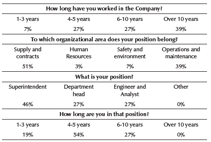 This information was very relevant, since it allowed us to conclude that those who answered the survey know well how the internal organization of the mining company works, possess the necessary knowledge and have sufficient experience both in the company and in the position, to be considered as informants. valid in quality, relevance and relevance (Table 4).