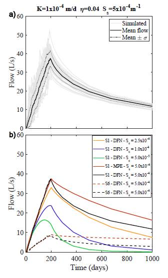 Figure 5: Hydrographs of the simulated groundwater inflows for DFN generations: a) setting 1 (S1); b) mean flow obtained using the DFN and EPM approaches using different fracture densities (settings S1 and S6) and DFN approach for S1, showing the influence of Ss (m-1) in the simulated flows.