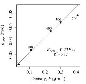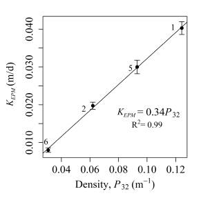 Based on the obtained results, DFN hydraulic parameters (introduced in the section named after them) were estimated and compared with previous studies (de Dreuzy et al., 2001b; Maillot et al., 2016) in order to validate the behavior of the generated DFN. Figure 6 displays the relationship between permeability and P32 for the settings where only the fracture density changes (S1, S2, S5, and S6). A linear relationship between the KEPM and the P32 is observed, as found by Maillot et al. (2016), but in a lower density range, considering that the estimated P32 for the analyzed configuration is below 1.