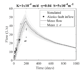 Figure 8: Groundwater inflows simulated for the 400-fracture setting and measured flow in Alaska fault zone (black dots).