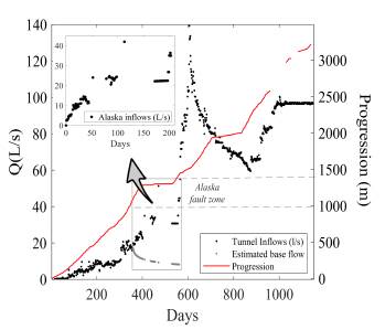 When a tunnel is being drilled, there is a flow peak as the drilling front disturbs the rock followed by the recession flow, which diminishes or disappears depending on the hydrogeological conditions. In this way, the total amount of water drained by a tunnel is the convolution of each individual hydrograph. In the La Línea tunnel, the accumulated groundwater inflows were measured daily at each entrance of the tunnel (IRENA, 2007). However, there is no information on the real infiltration rates in specific zones. Hence, based on the average of 100 numerical simulations using an EPM approach, the recession flow of the first 1 000 m of tunnel is obtained and then removed from the accumulated data. Figure 2 displays the inflows recorded at the western entrance and the progression in the drilling front (IRENA, 2007); the hydrograph of the infiltrated water in the Alaska fault zone (inner box in Figure 2) was built subtracting the aforementioned recession or base flow (gray line). There, the drilling process took about 200 days, and about 40 l/s were recorded.