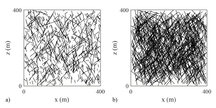 An example of the synthetic DFN generated using the log-normal (hypothetical case) and the exponential distribution for the fracture length with the same number of fractures is shown in Figure 4.