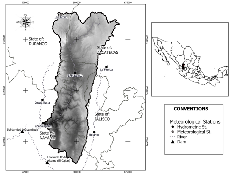 This study was conducted in a tributary of the Huaynamota River, also known as the Chapalagana or Atengo River, located in northwestern México between the states of Durango, Nayarit, Zacatecas, and Jalisco (INEGI, 2010) (Figure 1), between -104°33'34,16" and -103°27'29,84" W and between 23°28'50,05" and 21°23'57,62" N, with an area of 12 075,7 km2. The altitude varies from 219 to 3 147 masl. The concentration time is 39,88 h, the mean annual precipitation is 707 mm, and the mean annual temperature is 17,9 °C (SMN, 2019).
