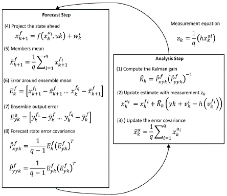 To extend the functionality of the DKF (Kalman, 1960) and deal with non-linear dynamic systems, the EKF, among others, has been proposed (Jazwinski, 2007; Welch and Bishop, 2006), which includes the EnKF (Evensen, 1994, 2009). The EnKF emerges as an alternative to the EKF, which has a high computational demand (Evensen, 1994, 2009) and is a sub-optimal estimator that, via Monte Carlo simulations, estimates the statistical error (Evensen, 1994; Gillijns et al., 2006; Rafieeinasab et al., 2014). Errors should satisfy the normal distribution assumption and are estimated based on sets of q values.