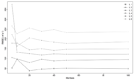 By means of the sensitivity analysis with 5, 10, 20, 30, 40, 50, and 100 members that were combined with the six steps, and based on the root mean square error (RMSE), the adequate number of members in the EnKF sets was determined (Quiroz et al., 2019). White noise that is integrated in the EnKF members was generated with the mvtnorm package (Multivariant Normal and t Distributions) (Genz and Bretz, 2009). In the evaluated Kalman Filter algorithms, the Q variance was assumed to be constant (Simon, 2001) with a value of zero (Morales-Velazquez ef al., 2014), and the R was assumed to have a near-zero value (0,01) in order to confer flexibility to the convergence of the algorithm (Welch and Bishop, 2006). With these values, the covariance matrices were created.