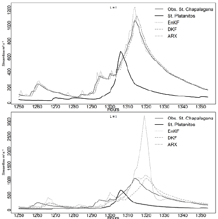 We implemented the EnKF (Evensen, 1994), DKF (Kalman, 1960), and ARX(1,1) (Bras and Rodríguez-Iturbe, 1985) algorithms. Forecasts were made at 1, 2, 3, 4, 5, and 6 h (L steps forward) of the flows at the Chapalagana station as a function of the flows at the Platanito station, located 100 km upstream from Chapalagana, as the exogenous variable. The hourly streamflow series between 9:00 hours on August 2 and 0:00 hours on September 28, 2017, were used, for a total of 1 360 registers supplied by Federal Electricity Comission (CFE).