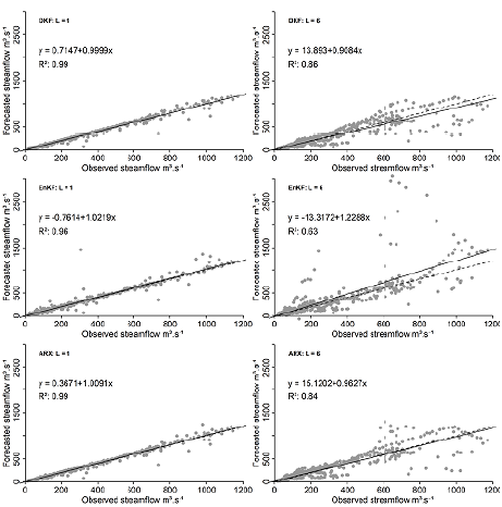 Hydrological phenomena such as streamflow have a non-linear behavior (Bai et al., 2016; Xu et al., 2009), especially when there are sudden changes in river levels. For this reason, the use of non-linear algorithms for data assimilation favors the fit of forecasts (Brandhorst et al., 2017; Medina-González et al., 2015). In addition, systematic errors can be reduced by recursive updating based on each new available measurement (Clark et al., 2008; Maxwell et al., 2018).