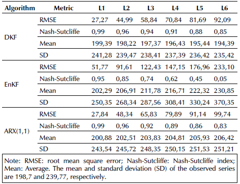According to the statistical indicators in Table 1, the NS shows similarities between DKF and ARX, with values of 0,99 and 0,83 in steps one and six, respectively, while EnKF obtained 0,95 and 0,05 in steps one and six. According to the NS, the fit of all the steps is less with EnKF; in step one, it is 0,04 less, and there is a marked change up to step six, where the difference is around 0,78. The mean of the predicted series is more stable with DKF, followed by ARX and, finally, EnKF. EnKF and ARX show an upward trend in the mean value for each step, whereas DKF has a downward trend.