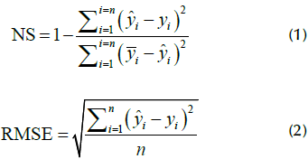 The fit reached by each algorithm was evaluated using the Nash-Sutcliffe coefficient (NS) (Nash and Sutcliffe, 1970) and the RMSE (Morales-Velázquez et al., 2014), as expressed by Equations (1) and (2). The assumed normality of errors was verified using graphs (González-Leiva et al., 2015).