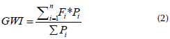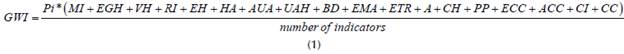 The proposed GWI is obtained from the weighted average of the 18 proposed indicators, which are analyzed via Equation (1).
