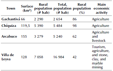 The towns selected for analysis were Arcabuco, Chíquiza, Gachantivá, and Villa de Leyva, which belong to the Cane River watershed. Their general characteristics are shown in Table 4.